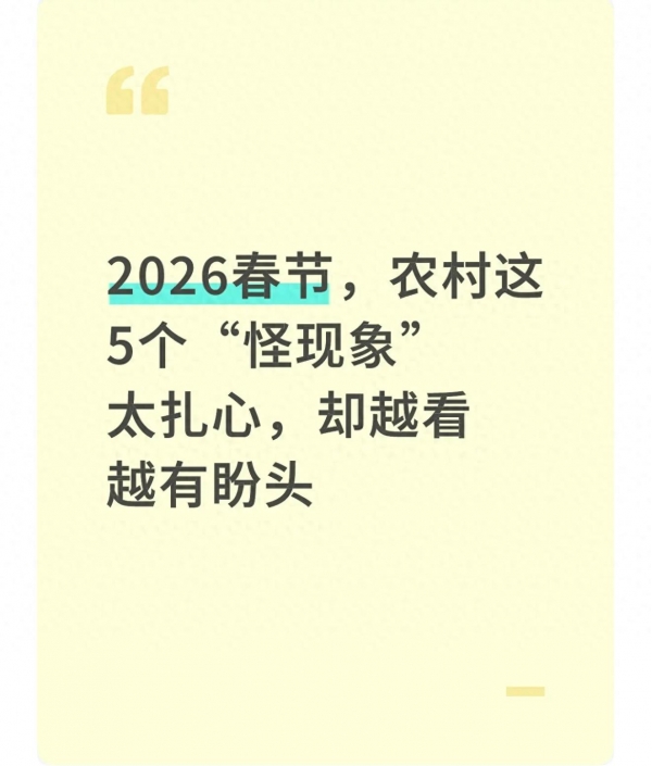 春节是团圆的节日,更是见证变化的窗口。2026年春节,不妨回到农村老家,亲身感受这些"怪现象"背后的新变化、新机遇。或许你会发现,那个曾经落后的乡村,已经变成了充满希望的热土;那个曾经单调的春节,已经变得丰富而有意义。