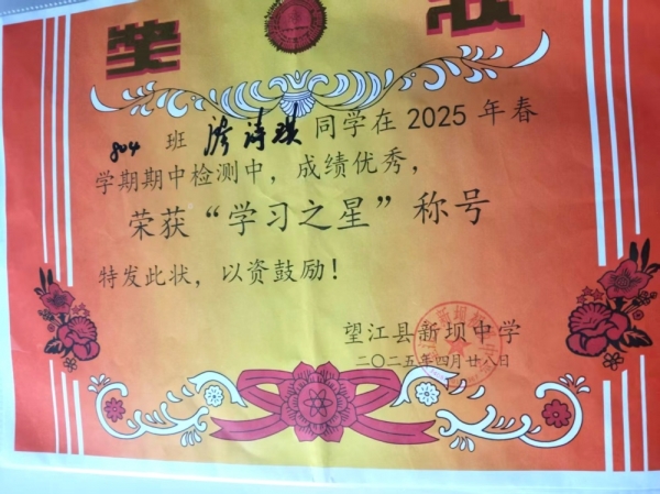 廖同学获得的奖状