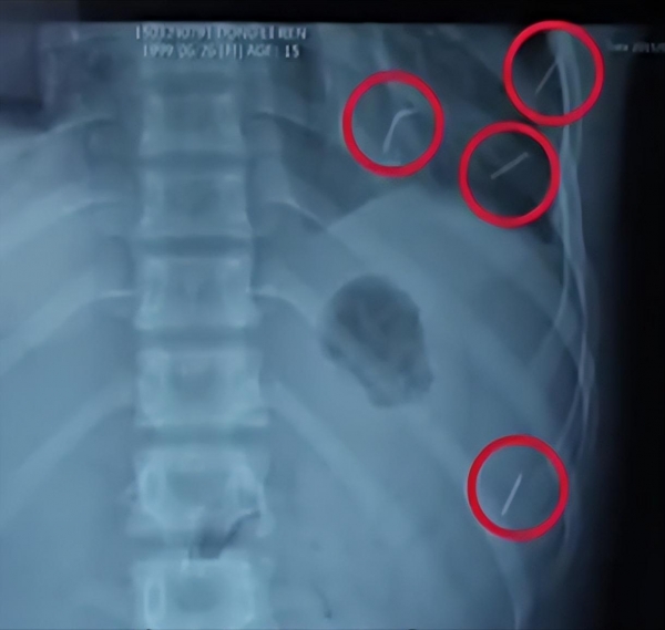 在董立仁的体内,有4根不一样长的细针,3根位于董立仁的胸部,1根位于腹部,不仅如此,3根位于胸部的细针中,竟然有1根正好扎在了董立仁的心脏上。