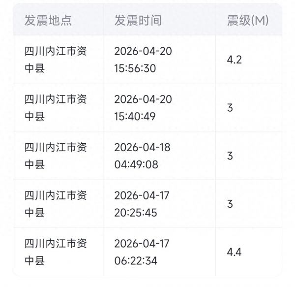 四川资中又地震了!中国地震台网刚发的消息,4月20日下午3点56分,内江市资中县(北纬29.68度,东经104.88度)发生4.5级地震,震源深度7千米。这已经是当地10天内第26次地震了,从4月11号开始就没停过,今天这次是继17号凌晨4.4级之后的又一次较强震动。