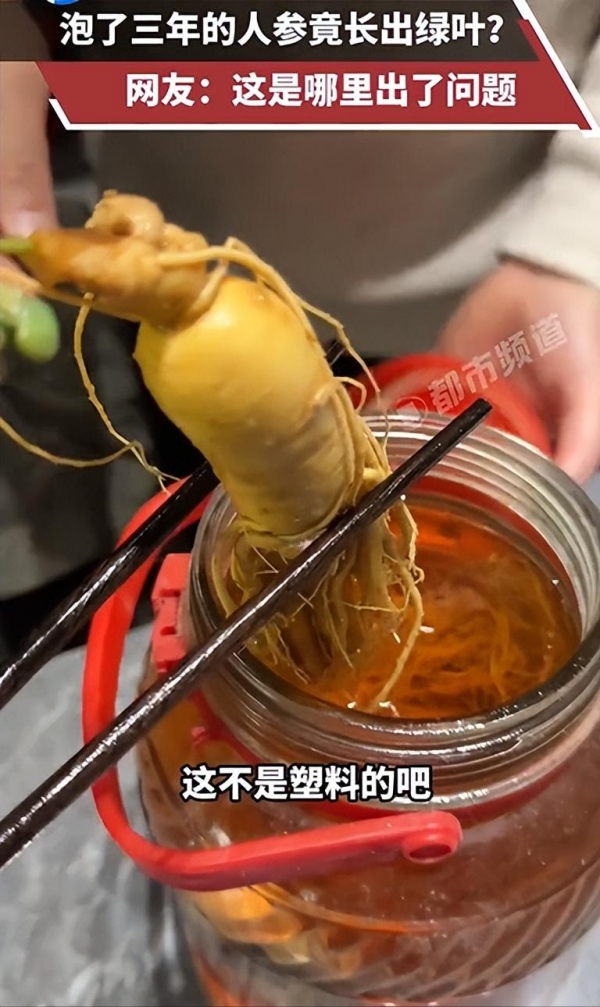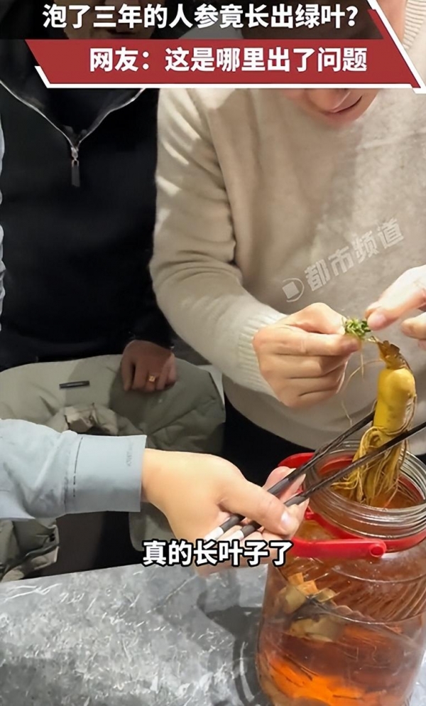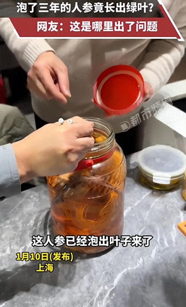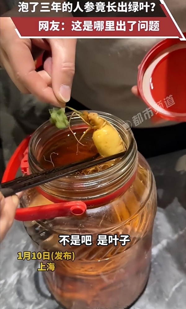 1月10日,上海报道,男子泡了3年的人参酒,人参突然长出了绿叶!当事人:50度散白酒泡的,第一次遇到