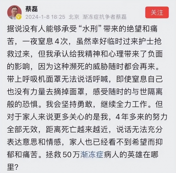 2021年12月20日,为了鼓励渐冻症病友,文质彬彬的蔡磊郑重其事地说: