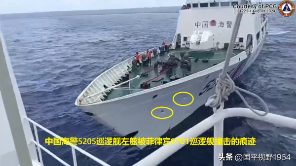 菲律宾海岸警卫队发言人杰伊·塔里拉在声明中称:中国海警5205舰先是接近菲律宾9701舰,采取危险动作撞击9701舰左舷船头。然后5205舰没有停留,调转船头撞击9701舰右舷,再然后绕了一圈,再次撞击9701舰。