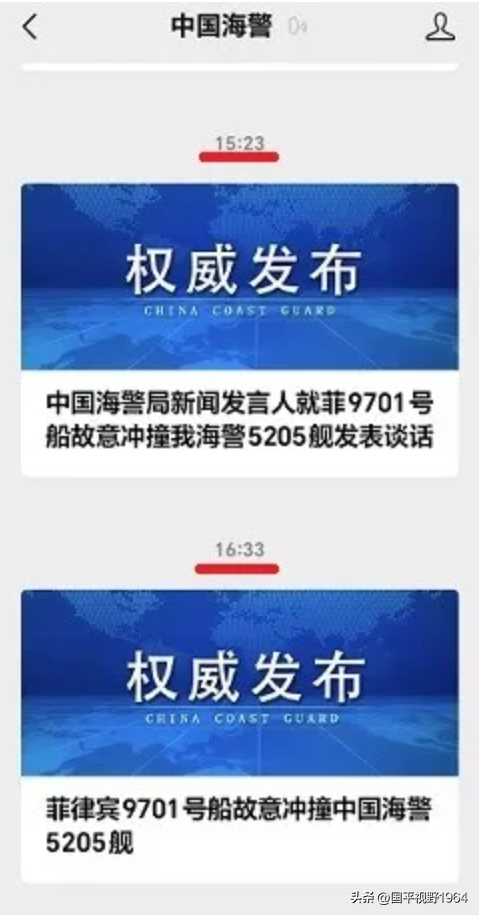 根据中国海警官方微信号发布的具体详情,12时06分,菲9701号船以不专业、危险方式故意冲撞中方正常维权执法的5205舰,导致发生擦碰。