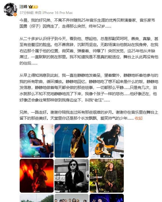 韦国勇人还没到老,就突然没了。看汪峰说话,大家才知道这事是真的,都是汪峰这么用心的人,还难受地发了长文。25年一直在旁边用贝斯陪着舞台,连影子都成了习惯。韦国勇长头发,人品好,音乐队里的人都喜欢他,外号叫"伢子",听着挺亲切。