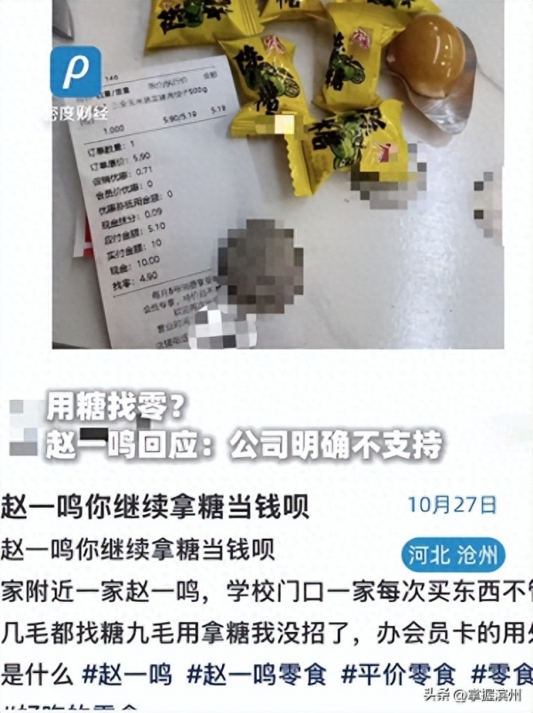 "赵一鸣你继续拿糖当钱呗!"近日,一位河北的网友发帖称,其家附近有一家赵一鸣零食店,拿现金去购物,结账时店员却用陈皮糖"找零"。"每次买东西不管几毛都找糖,九毛都找糖,我没招了。"27日,记者致电该门店,门店承认有用糖果"找零"的行为,因为兑角、分现金困难,才用糖果"找零",会和顾客做好沟通解释。