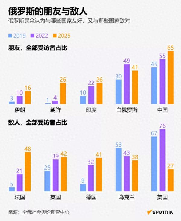 据俄罗斯卫星通讯社报道,近日,俄罗斯全俄社会舆论调查中心,公布了一份调查报告,这份报告追踪从2019年到2025年,俄罗斯民众对于其它各国的看法。