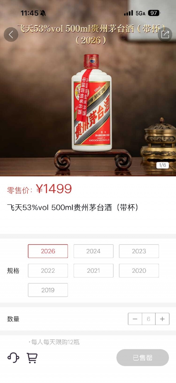截至记者发稿时,i茅台APP仍显示2026年款飞天茅台"已售罄",2019至2024年份产品则标注"敬请期待"。据媒体报道,每日投放量并非固定数值,网传"每日投放100吨"为不实消息。