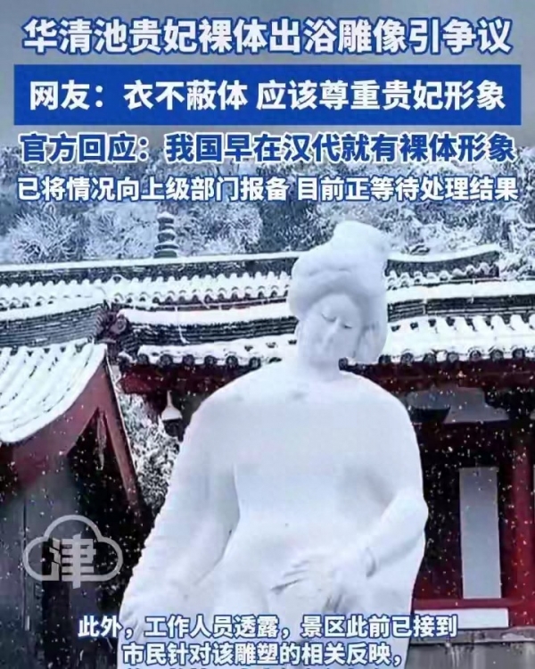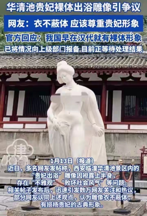 最近西安华清池景区有点闹腾。很多人在微博发视频说那边有个"贵妃出浴"的雕塑,上身没穿衣服,看起来不雅观。有人觉得这破坏了杨贵妃高大上的形象,还有人骂"败坏风气"。事情火到评论区能刷出几万条,但景区没急着改,说这是33年前的老东西,当时审批过,现在正等上级意见。
