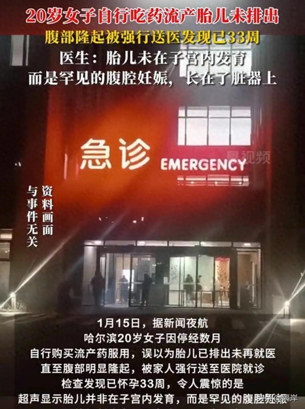 哈尔滨最近发生一起让人震惊的医疗事件。一名20岁姑娘因为停经几个月,自己上网查攻略买了流产药吃。她以为吃药后胎儿就排出来了,结果肚子一直变大,最后家人强迫她去医院检查才发现,肚子里已经长到快8个月大,而且胎儿根本不在子宫里,而是长在了腹腔器官上。医生说这种情况全世界都很少见,像她这样活到33周才做手术的更少见。