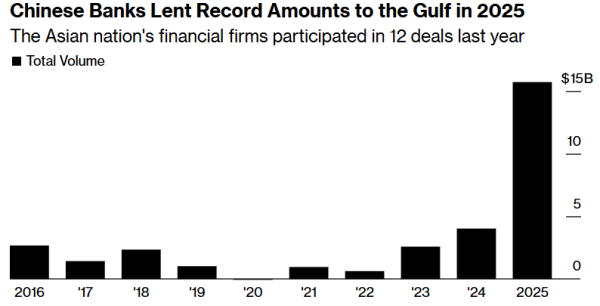 中国银行业2025年向海湾地区贷款额创历史新高,国内金融公司去年参与了12笔交易。彭博社制图