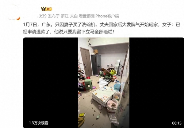 有网友爆料称:1月7日,广东。只因妻子买了洗碗机,丈夫回家后大发脾气开始砸家。