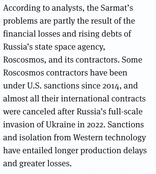 虽然俄罗斯多次提到萨尔马特导弹使用了各种先进技术,威力十分强大,但是萨尔马特本身的推进系统却捉襟见肘,并没有使用常规核导弹常用的固态推进系统。