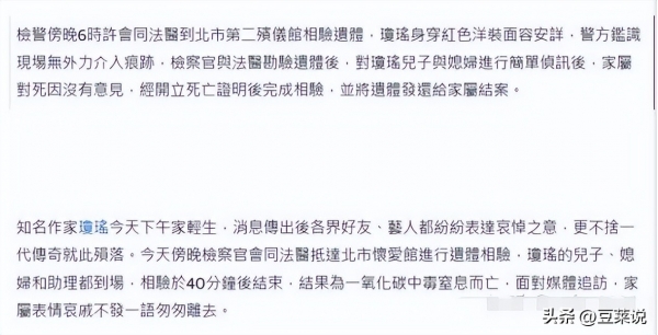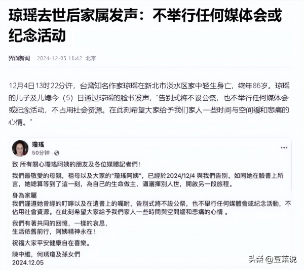 然而,警方在调查后表示,琼瑶离世的整个过程并无异状,家属也对死因无异议。这也意味着,琼瑶的家人和秘书在法律上并没有过错。