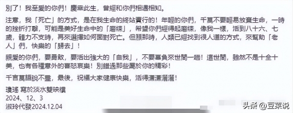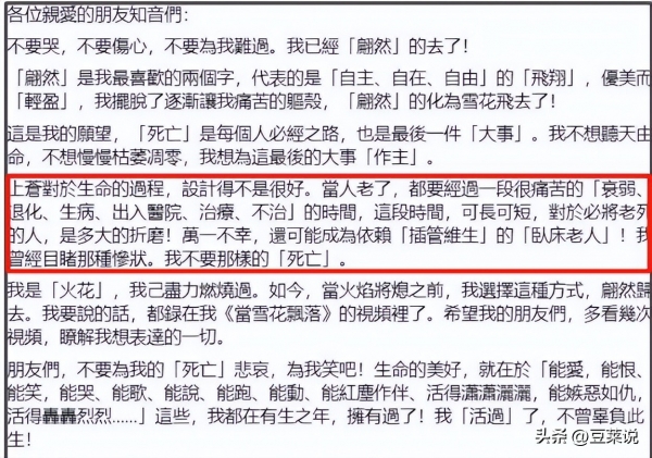在信中,她回顾了自己丰富多彩的人生经历,表达了对生命的理解,以及选择离开的理由。