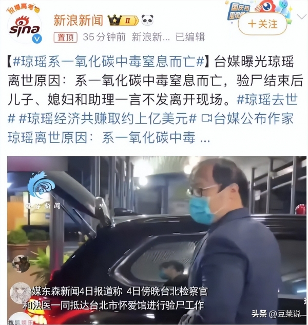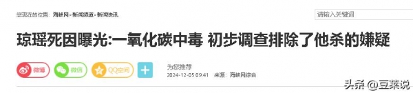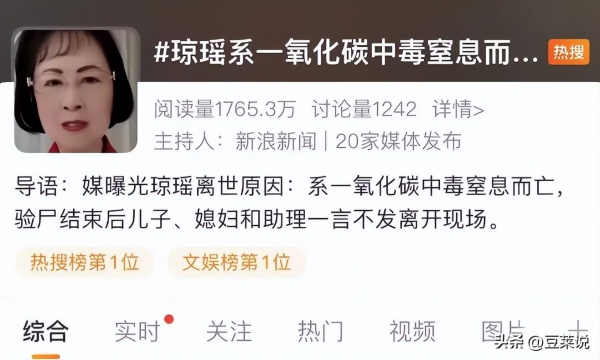 参考资料:海峡网综合--琼瑶死因曝光:一氧化碳中毒 初步调查排除了他杀的嫌疑