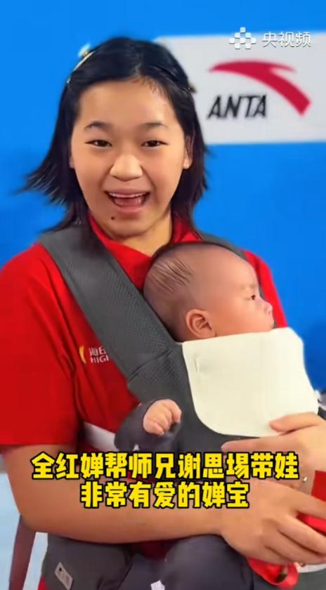 赛场上的全红婵是王者,赛场下的她还是那个朴实的小姑娘,全运会期间央视放出一段她帮师兄谢思埸带娃的视频,抱着孩子的姿势有模有样,哄起娃来耐心十足,网友都亲切地叫她"红姨"。