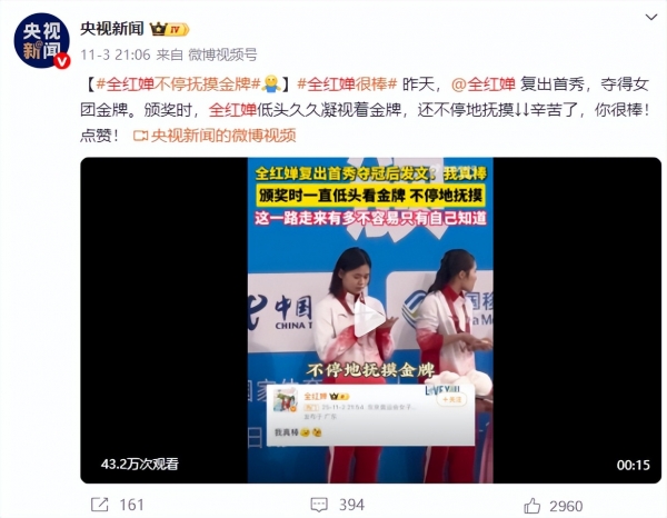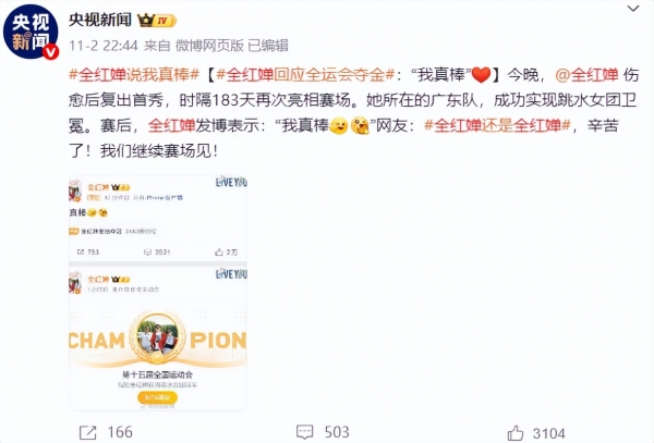11月3号晚上央视专门发动态讲全红婵的辛苦,还重点提了她凝视金牌的画面,把她半年来的坚守和不易都说了出来。