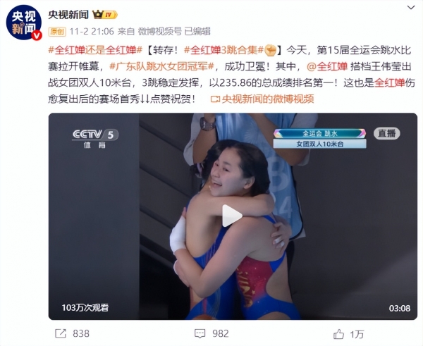 11月2号那天央视官方社交账号足足发了7条关于全红婵的动态,从清晨训练到晚上夺冠全程跟踪,这种"排面"在运动员里实属罕见。