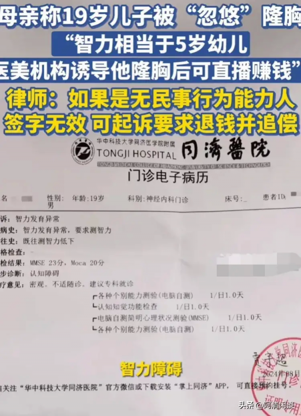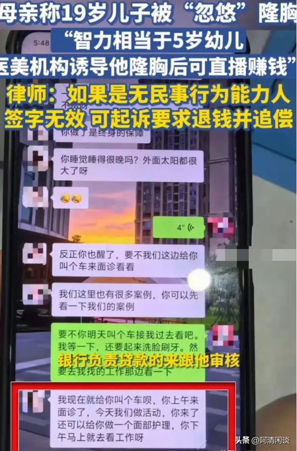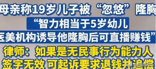 他母亲决定找医美机构算账,还找了律师帮忙。律师说,这孩子心智不全,签的合同没效力,家里可以告他们退钱,甚至索赔。
