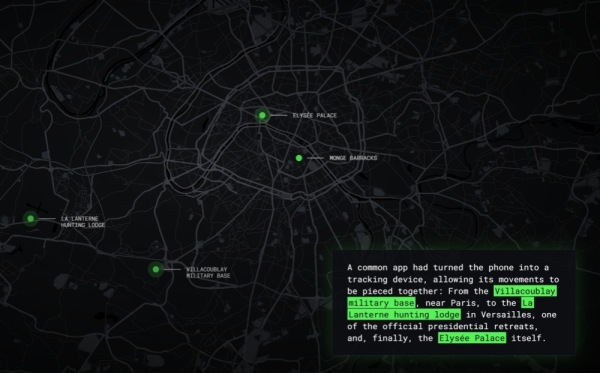 《世界报》通过广告数据拼凑出一名疑似马克龙身边安保人员的行踪,包括维拉库布莱军营、爱丽舍宫等。
