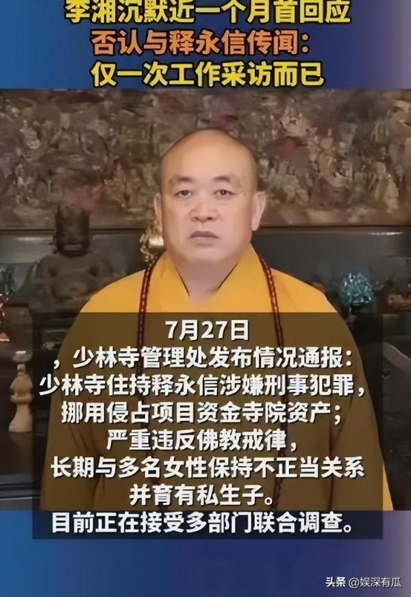前段时间网上炸锅了,说李湘和释永信关系不一般,还传出来所谓的"亲密照"。