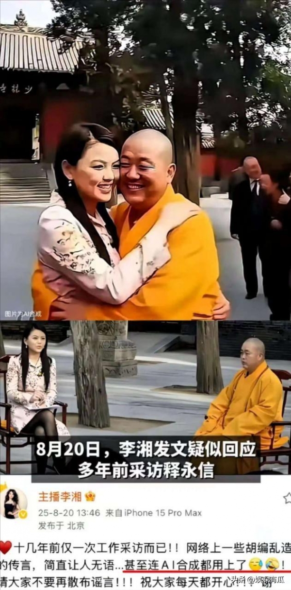 就像李湘与释永信的关系被造谣,一张AI合成照、一段被曲解的采访视频,已经引起了轩然大波了。
