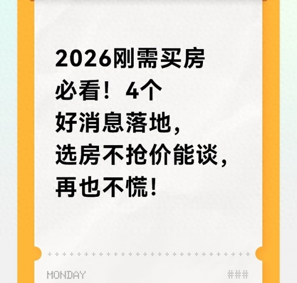 其实刚需真没必要盯着房价涨跌瞎焦虑,比起赌房价反弹,不如看看当下实实在在的买房环境。2026年的楼市早没了以前的狂热,反而对刚需越来越友好,这4个好消息,条条都落到实处,关乎选房自由、议价底气,还有往后的居住舒心度,今天纯大白话给大家讲透,全是身边刚需的真实买房情况,看完直接对号入座,买房心里有谱不踩坑。