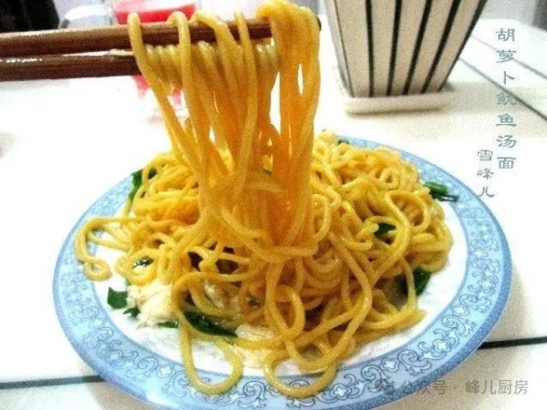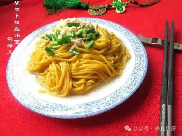 做法:1、胡萝卜榨汁,面条机里加入面粉,加入胡萝卜汁,压出细面条。2、鱿鱼头洗净切丁,姜切丝,韭菜切碎,鸡蛋打散。3、锅里放入花生油,下姜丝爆香,下入鱿鱼丁炒一下,加水,水开后,淋入鸡蛋液,加入韭菜烧开。4、锅里放水,烧开下入面条,面条浮起即可。5、把面条捞起,加入熬好的鱿鱼汤,胡萝卜鱿鱼面就上桌了。