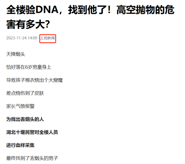 2023年11月24日,上观新闻报道,在湖北十堰有人高空抛烟头,烫伤了楼下的小男孩,最终警方经过对全楼人员的DNA检测,找出了真凶。