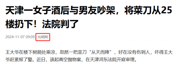 2024年11月7日,光明网报道,天津一女子酒后因为和男朋友吵架,就将菜刀、锅盖等东西从窗户扔下。