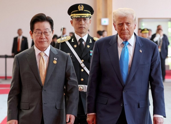 韩方的接机规格很高,韩国外长赵显在旋梯处迎接特朗普,停机坪上铺设了红地毯,还有仪仗队分列于两旁,并鸣放21响礼炮。
