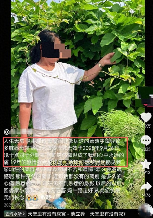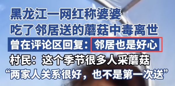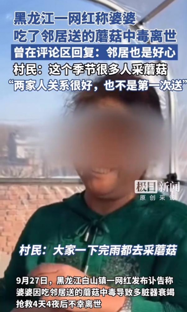 9月27日早上,拥有18万粉丝的黑龙江一网红发布讣告,称自己的婆婆因为吃了邻居送的蘑菇导致全身器官衰竭,抢救无效死亡。
