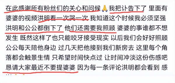 博主在视频中说,自己要坚强,因为自己的老公和公公因为婆婆的去世受到不小的打击,都倒下了,自己也需要照顾他们,希望网友们不要在视频中留言关于婆婆的信息。