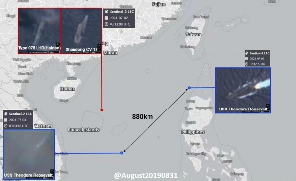 根据当时的卫星图像显示,在7月3日,美国罗斯福号航母打击群就经巴林塘海峡进入了南海,而到了7月4日,罗斯福号航母航行至了西沙群岛以南海域,距离山东号航母编队不足500公里,此时中美航母打击半径均可以有效覆盖对方。鉴于中美海军一直在暗中较劲,因此中美航母都不会错过这难得的"切磋"机会,很有可能会进行一些试探性的攻防行为。