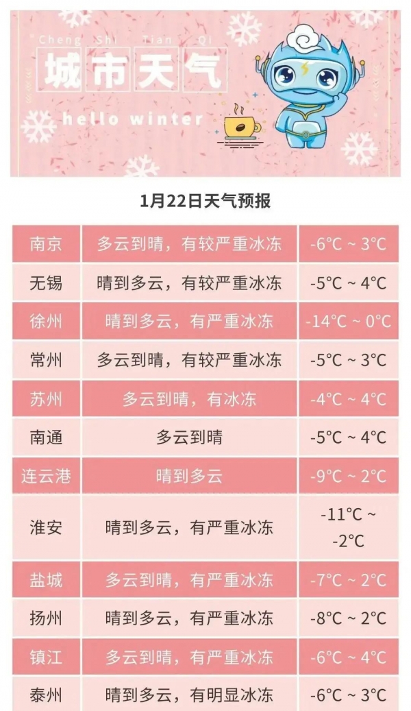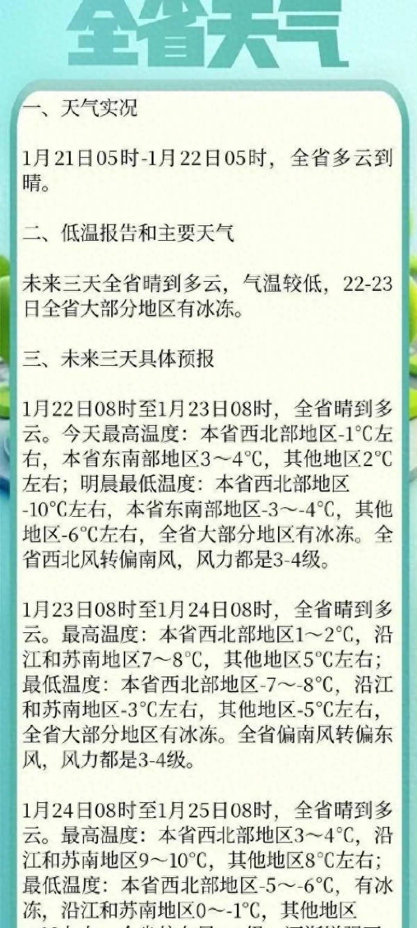 再看详细的城市预测。比如南京在天气变化中具有代表性,1月22日早晨南京最低气温降到-4℃到-5℃,且存在严重冰冻。当天南京天气为晴转多云,气温没怎么回暖,北风转东风,风力维持在3-4级,白天气温最高只有2到3℃,随着寒潮慢慢减弱,气温在之后几天会逐渐回升,1月23日南京最高气温能达到7到8℃,1月24日最高气温能达9到10℃,夜里最低气温仍保持在-3℃到-4℃,虽有早晨轻霜或冰冻,但冷意已明显减弱。