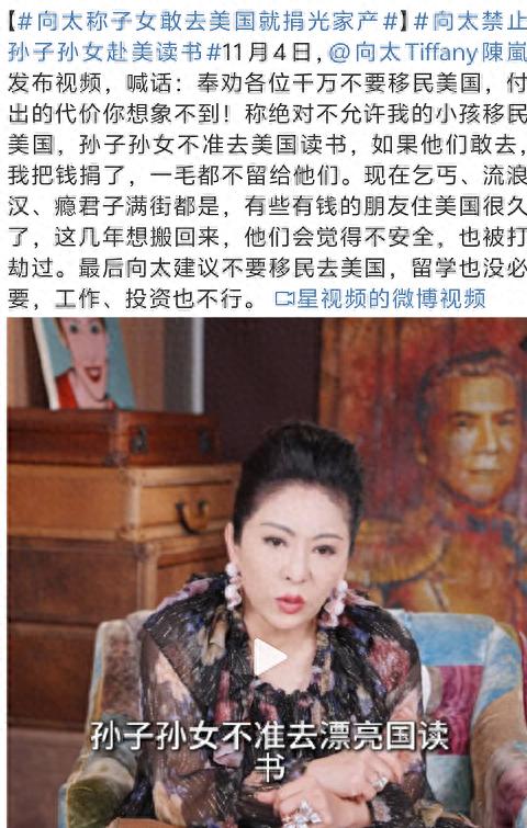 2025年11月4日,78岁的向太陈岚在抖音发布的一段视频震惊全网--这位手握中国星集团半壁江山的娱乐大亨,对着镜头撂下狠话:"我的子女敢移民美国,孙辈敢去美国读书,我就把32亿家产全捐了!"