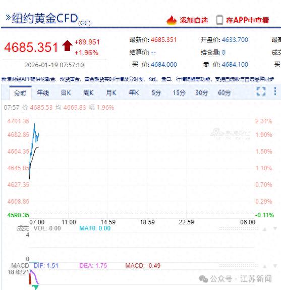 1月19日,金价跃升至纪录高位,纽约期金突破4670美元/盎司,日内涨1.62%。现货黄金一度突破突破4690美元/盎司,日内涨2.06%,突破历史新高。截至发稿报4685.351美元/盎司,日内涨1.96%。