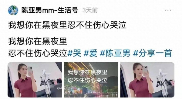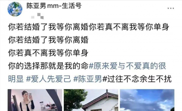 眼见人气和流量大量流失,陈亚男又蹭上了朱家的流量,还发文"你若结婚了我等你离婚,你若真不离我等你单身",这些话明眼人一看就知道是在说谁,