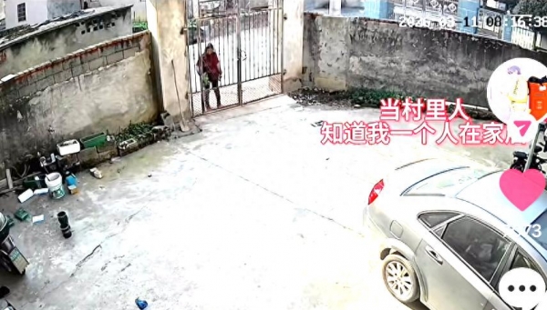 监控视频里邻居在给院子里塞蔬菜。