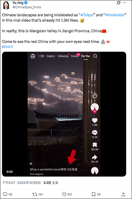 TikTok平台数据显示,这波热度自11月中旬开始发酵,至12月初累计互动量已超过1300万次,很多网民称部分帖子正是被错误地标记为"东京"、"日本"才获得大量传播。
