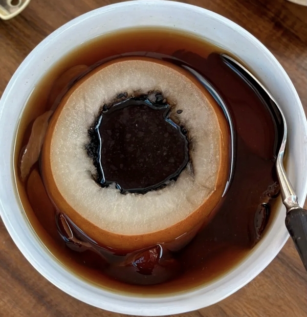1. 雪梨用盐水洗干净,不用削皮。从顶部横切一刀当盖子,用勺子挖掉梨核。