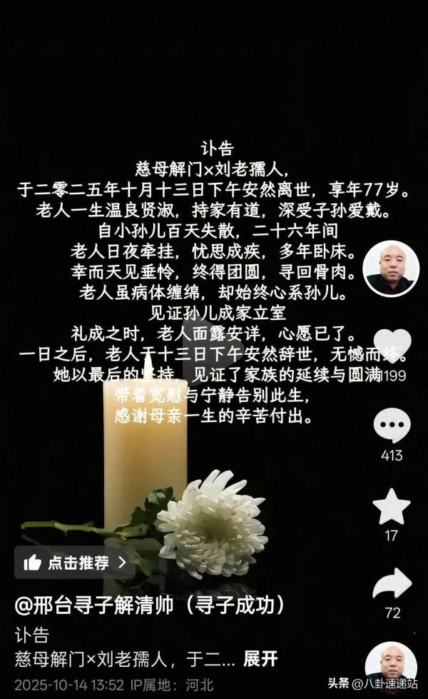 到了10月14号,解家发了讣告说奶奶去世了,老人家今年77岁,自从孙子走丢后奶奶每天都牵挂着孙子。