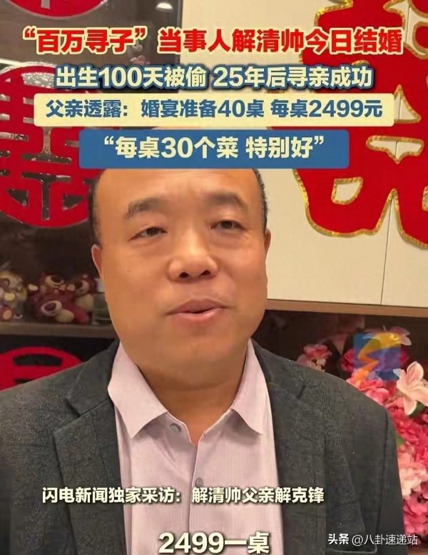 10月12号时,被拐走二十多年的接清帅结婚了,当时婚礼排场很大,网传有30辆红旗车组成的车队,婚宴一共四十桌。