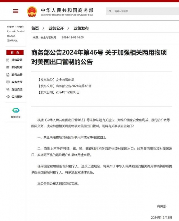 12月3日,中国商务部发布公告,决定加强有关两用物项对美国出口管制。