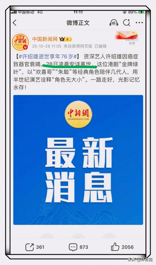 资深艺人许绍雄因癌症致器官衰竭,28日凌晨安详离世。这位港剧"金牌绿叶",以"欢喜哥""朱聪"等经典角色陪伴几代人,用半世纪演艺诠释"角色无大小"。一路走好,光影记忆永存!
