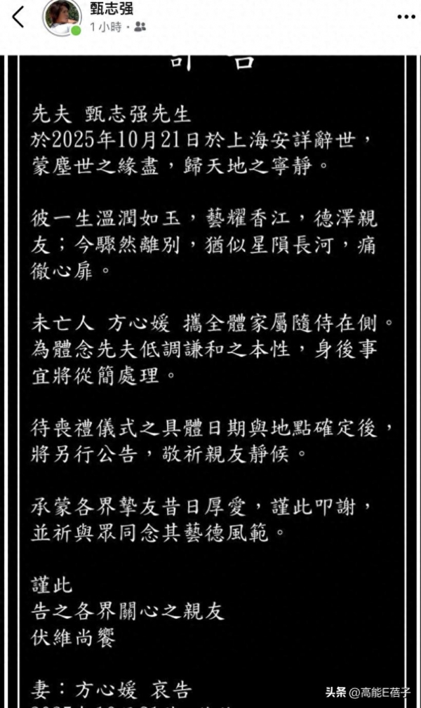 今天,港圈传来噩耗:亚视艺人甄志强离世了。