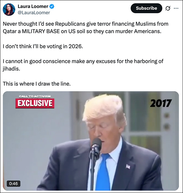 美国《国会山报》、英国路透社等媒体当天报道称,消息一经公布,立即引发了特朗普阵营内最亲近盟友的愤怒与批评,极右翼网红劳拉·卢默认定该计划意味着"卡塔尔要在美国领土上建军事基地",并直言感到"被背叛",这件事可能会让她在2026年选择不投票。