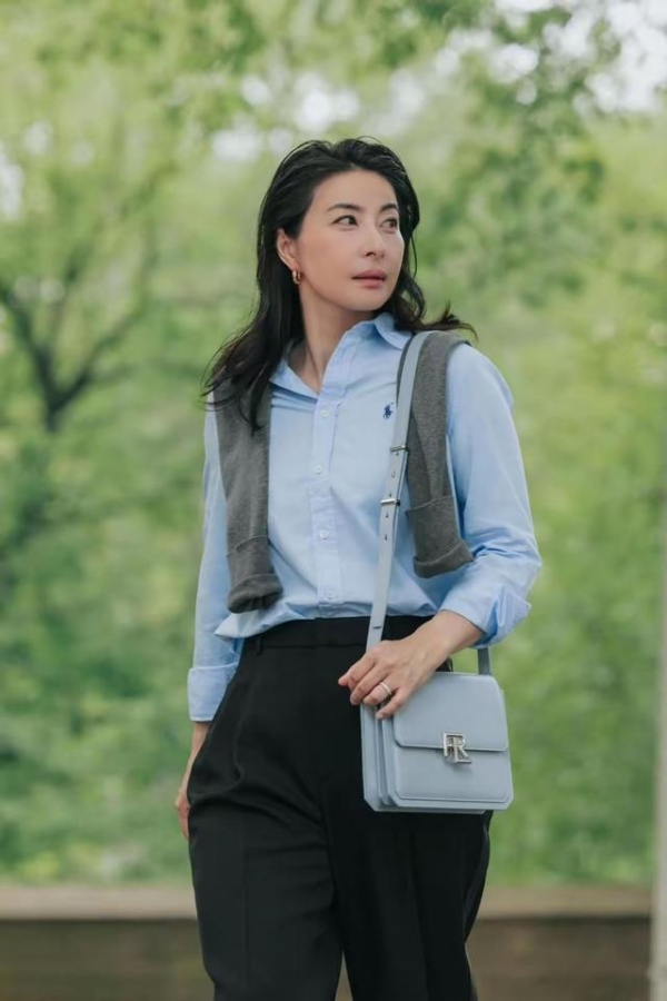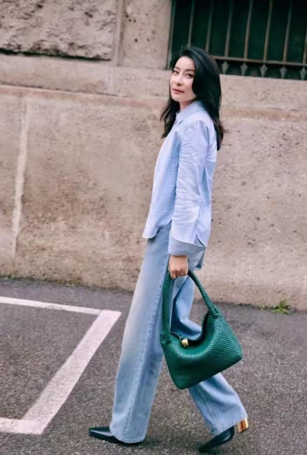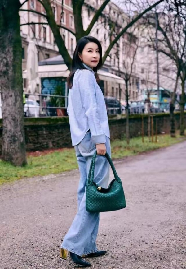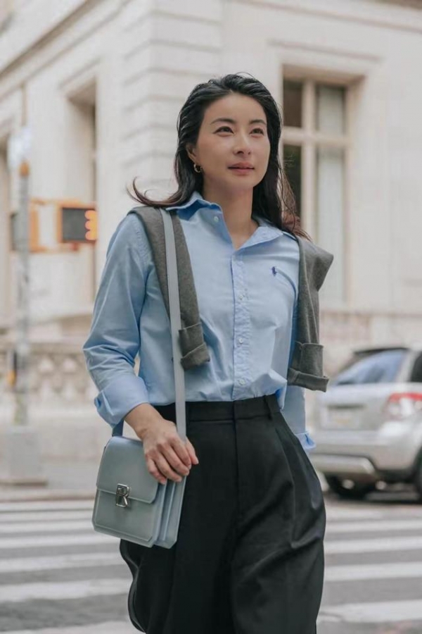 她的穿搭中,"衬衫"出镜率最高。譬如这身"蓝色衬衫+黑色阔腿裤+灰色披肩"这身造型,优雅干练又不失时髦感。