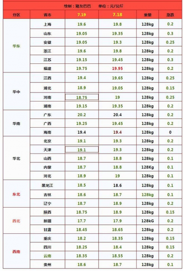 生猪市场:7月进入中下旬,近期,国内猪价高歌猛进,市场再次呈现拉锯的走势,尤其是,6月20日以来,端午节后,猪价触底17.35元/公斤,市场情绪偏强,养殖端认卖心态转弱,二次育肥频繁入场,猪价呈现震荡走高的局面,价格连创阶段性新高,此前,外三元猪价涨至19.16元/公斤,生猪均价触及最近2年的高点,养殖利润大幅修正,市场提前兑现了年初的预期!